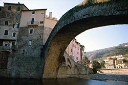 Of the castle, built in 1151 and definitively destroyed in 1887, only the ruins remain, perched on a rocky spur dominating the medieval village at the foot of the Rebuffao mountain. The houses, sometimes six floors high, lead down to the river called "la Nervia". A single-arched bridge with a span of 33 m joins "la Terra" to "Borgo", the new part of town built in the 15th century.